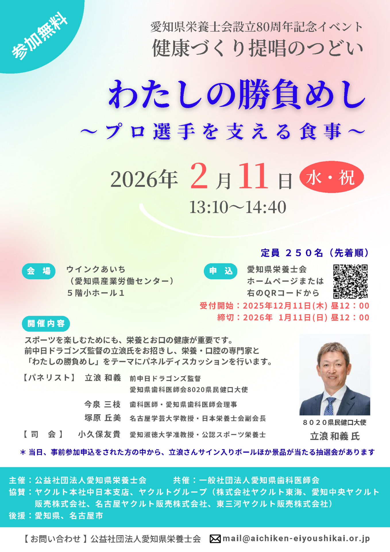 前中日ドラゴンズ監督の立浪氏をお招きし、栄養・口腔の専門家と「わたしの勝負めし」をテーマにパネルディスカッションを行います。